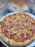 Pepperoni, sausage, bacon, beef, and cheeses (red sauce).